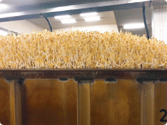 栽培台車から顔を出すもやし